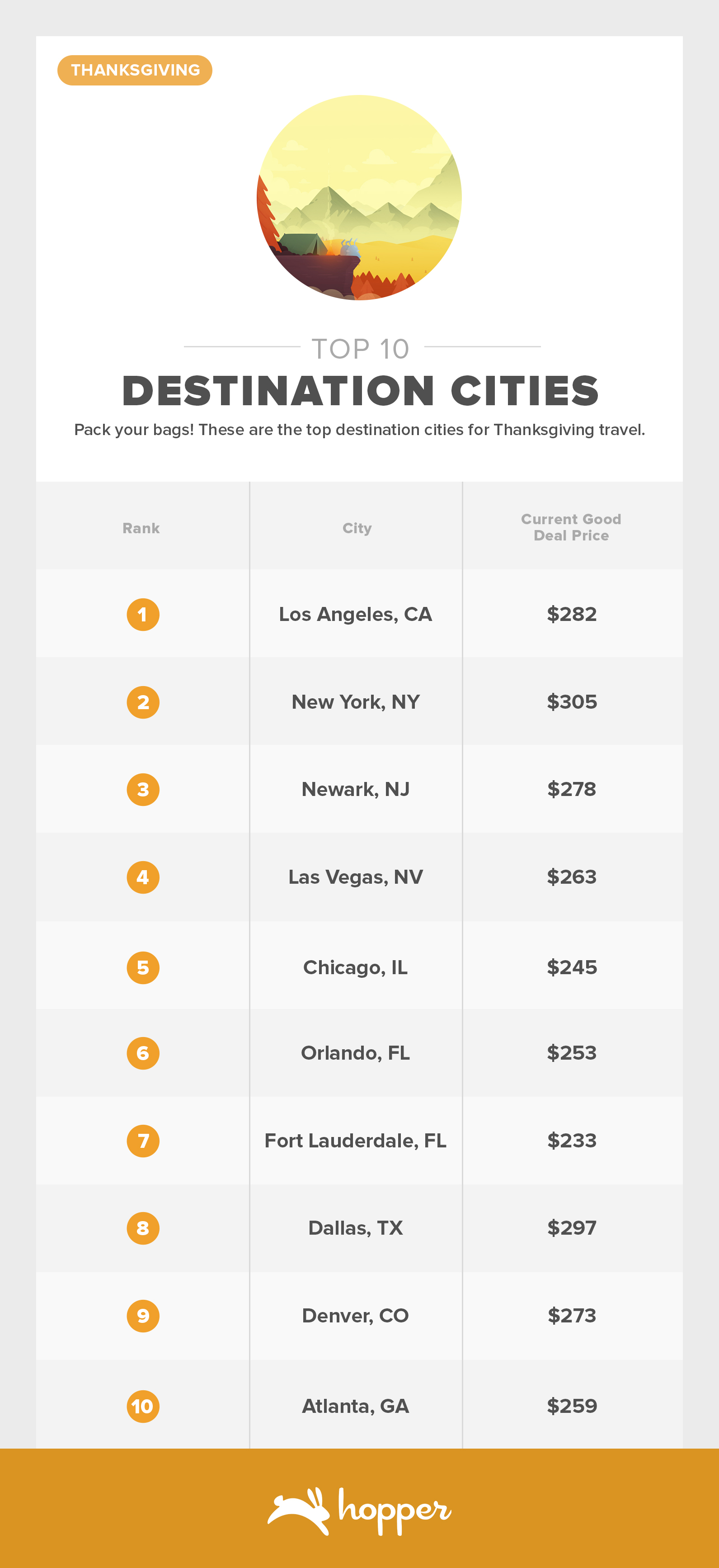 The most popular destinations for Thanksgiving this year are Los Angeles and New York City, with prices hovering around $350 round-trip.