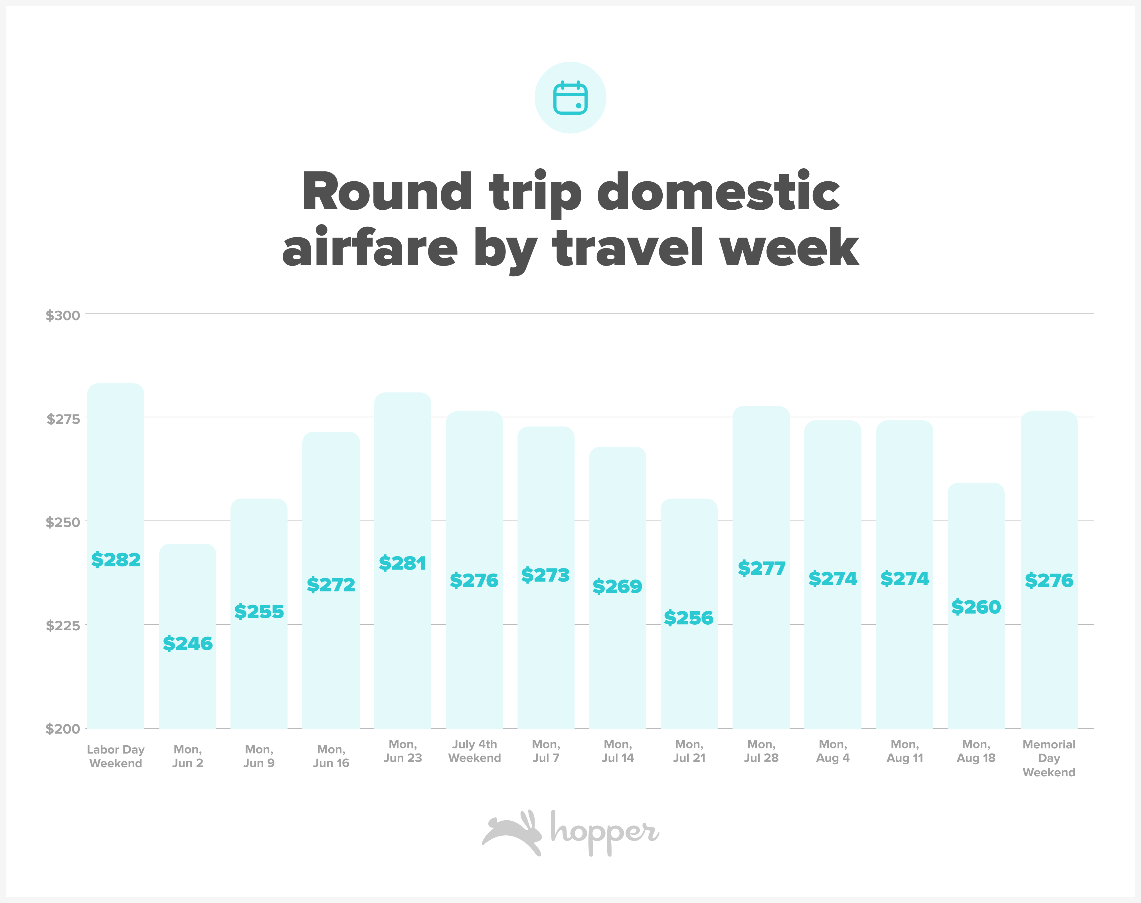 Travelers can find the best deals by flying in early June or mid-July. In contrast, airfare tends to spike during federal holiday weekends like Memorial Day, the 4th of July, and Labor Day. Traveling during these peak times can cost about $81 more per ticket, roughly 34% higher than the cheapest weekends of the summer.